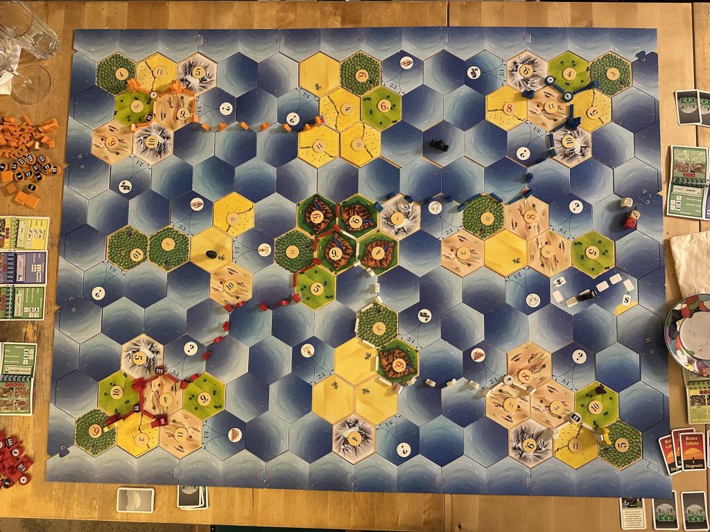 Und so ganz nebenbei konnten wir noch eine Runde Siedler von Catan am Wochenende einbauen. Da es eine neue Mitspielerin gab, wählten wir ein weniger kriegerisches Setting.